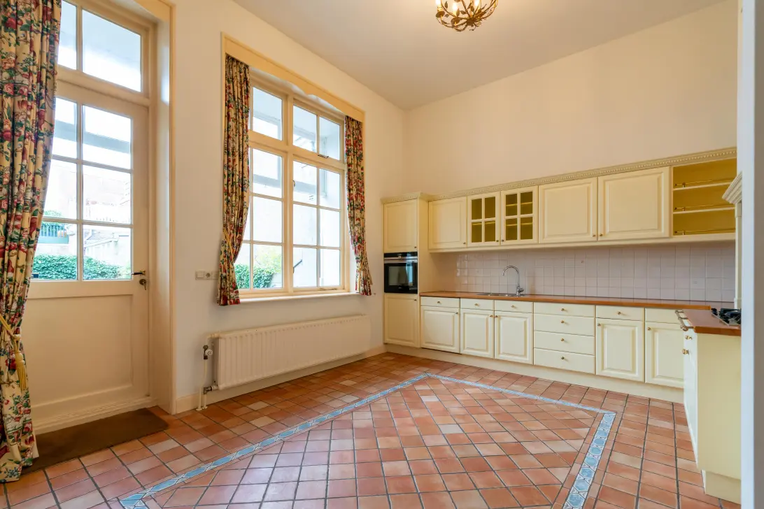 Voorportaal met marmeren vloer, grote centrale hal met marmeren vloer, moderne wc, garderobekast. Voorzij-studeerkamer. Prachtig brede zit-/eetkamer en suite met originele schuif separatie doorlopend in de zonnige serre. Beide kamers met fraaie visgraat parketvloer. In de zit-/eetkamer bevinden zich 2 fraaie schouwen waarvan 1 met open haard. Gezellige, luxe grote woonkeuken met alle gewenste inbouwapparatuur en deur naar de fraai aangelegde achtertuin op de middag- en avondzon.