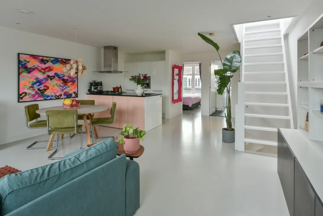 This wonderfully bright, perfectly laid-out, and very attractive one-bedroom apartment of 64 m2 is situated in a characteristic building dating from 1902 (renovated in 2015) and it truly has it all! Private entrance from the third floor, spacious bedroom, freehold property (no ground lease), modern open-plan kitchen, generous living room, fantastic rooftop terrace, renewed foundation, high-end finishes, fresh bathroom, smart layout, active homeowners’ association (VvE), double glazing, sleek epoxy flooring, and above all, a prime location in the vibrant Javastraat in Amsterdam East!