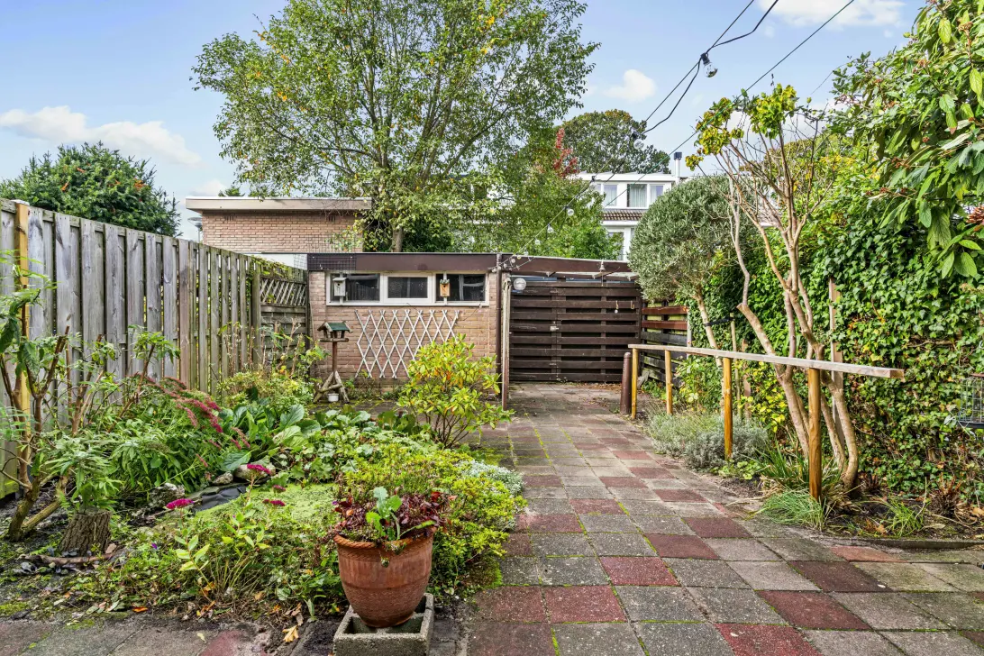 De achtertuin ligt op het westen en biedt veel privacy. Achterin de tuin staat een stenen berging met elektra, en de tuin is bereikbaar via het achterpad. Op de achtergevel van de woning bevinden zich en buitenkraan en een elektrisch zonnescherm.