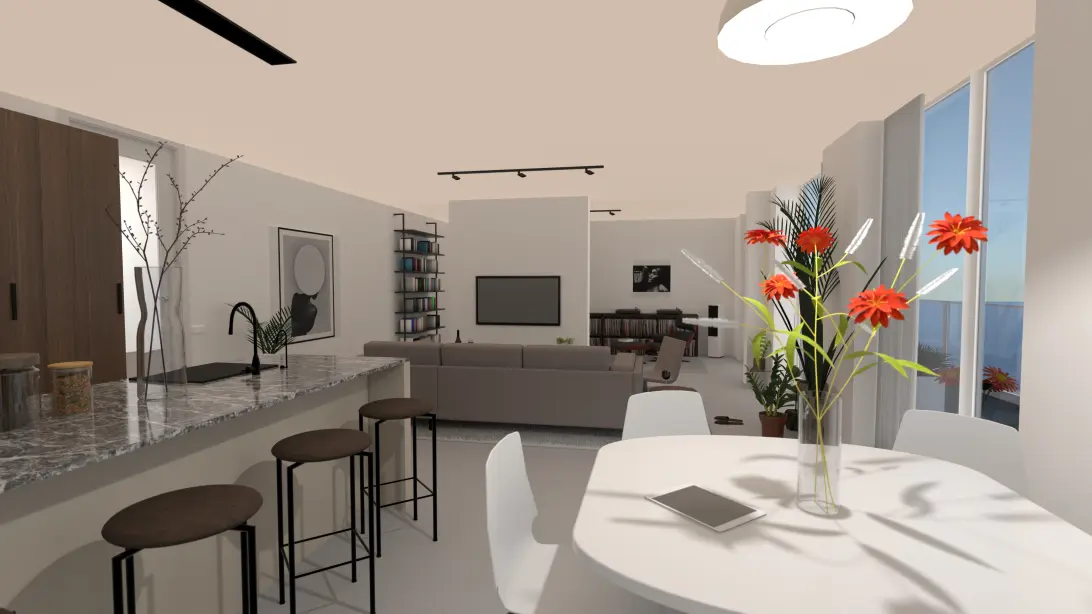 The generous living area is surrounded by large floor-to-ceiling windows that allow an abundance of natural light to flood the space. Thanks to its dimensions and bright atmosphere, the room feels exceptionally open and inviting.