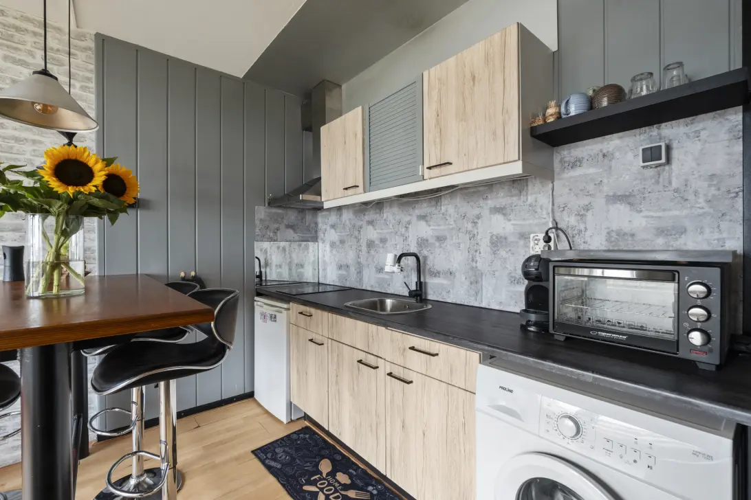 Met een slimme indeling is het studioappartement in te delen met een zithoek, eettafel, een grote (garderobe)kast en een slaapgedeelte. Er ligt laminaat op de vloer, de wandafwerking is fraai en via de ramen aan de zuidkant valt veel licht naar binnen. In de keuken staat een wandopstelling met een kookplaat en een afzuigkap.