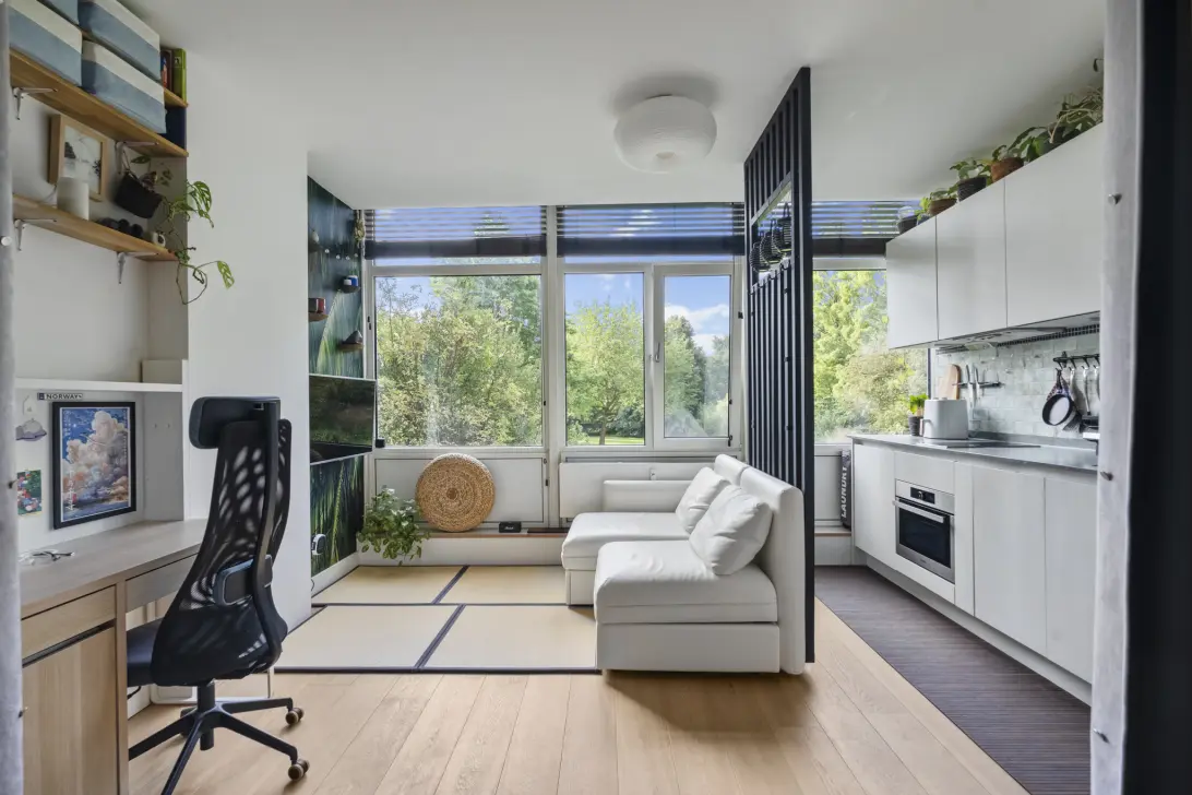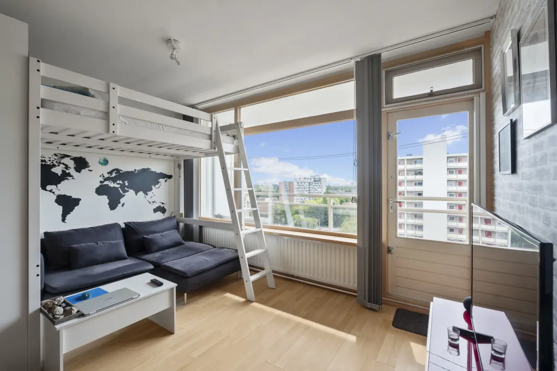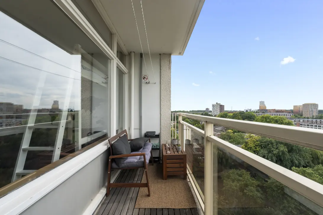 Wat dit studioappartement heel aantrekkelijk maakt, is het meer dan 4 meter brede balkon op het zonnige zuiden. Dit is een heerlijke plek om (samen) buiten te zitten, met uitzicht om van te dromen. Vanaf deze hoogte kun je goed zien hoe groen Amsterdam-Noord is! Blikvangers zijn het uitgestrekte Baanakkerspark en de hoogbouw bij winkelcentrum Waterlandplein. Maar er is nog veel meer moois te zien…
