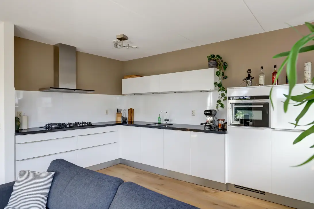 Aan de voorzijde is de woon-/eetkamer, met fijne lichtinval aan drie zijden. De vier zijramen zijn gericht op het westen (zon tot in de avond) en de pui met openslaande deuren op het zonnige zuiden. In de open keuken staat een stijlvolle, moderne hoekopstelling met een 5-pits gaskookplaat, afzuigkap, vaatwasser, combi-oven, koelkast en een grote vriezer met 4 lades! Het aanrechtblad is van zwart graniet en de brede lades bieden, net als de kasten, veel bergruimte. Met een oppervlakte van ruim 50 m2 bieden de woonkamer en keuken veel meer ruimte dan de buitenzijde doet vermoeden.