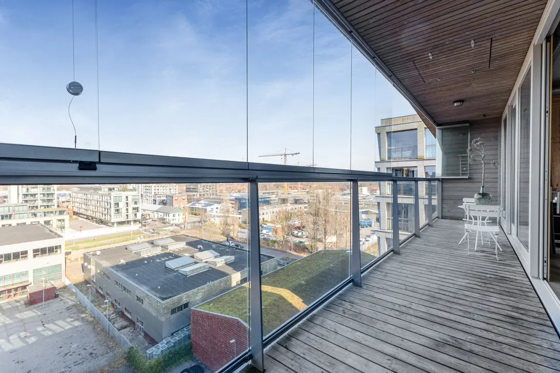 One of the apartment’s standout features is its generous 16 m² balcony, accessed through the impressive glass façade. Finished with wood and fitted with sliding glass panels, this outdoor space can be enjoyed throughout the year. In summer it functions as a spacious terrace, while in winter it becomes a bright conservatory. In both cases, you can enjoy the unobstructed views over Amsterdam-Noord.