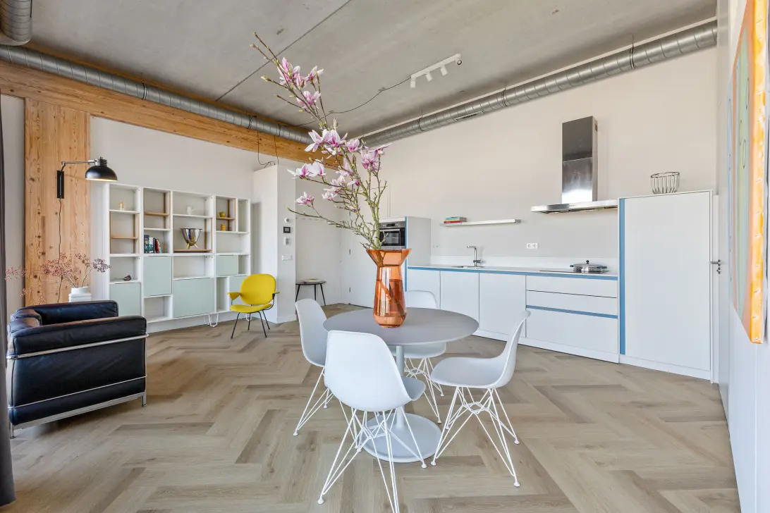 The practical layout offers space for a comfortable living and dining area. The modern open kitchen is equipped with an induction cooktop, extractor hood, dishwasher, refrigerator with freezer compartment, and a combination oven. There is also ample storage space. Next to the kitchen there is plenty of room for a large dining table.