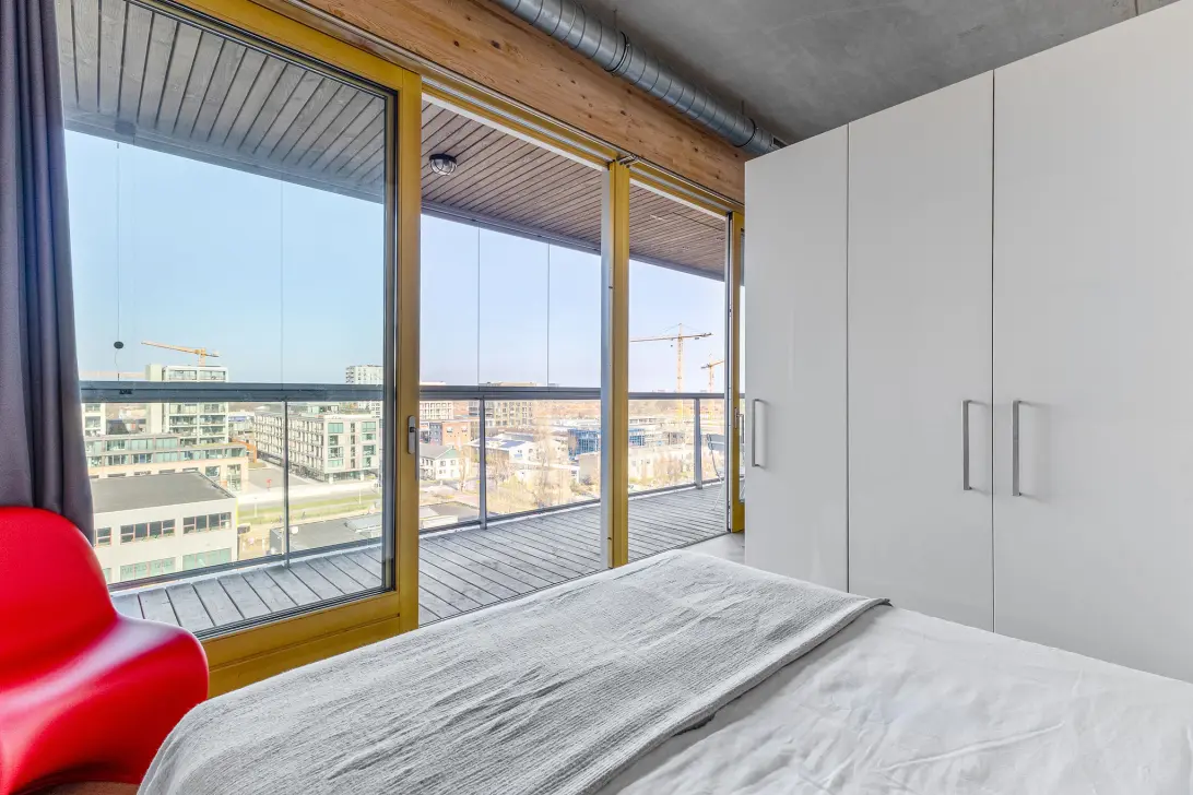 The apartment is located on the sixth floor and is accessible by both elevator and staircase. With a ceiling height of 3.5 meters and a full-width glass façade, the apartment immediately makes an impression. The efficient layout and abundance of natural light create a spacious and open feel. The apartment retains its visible industrial elements, which, combined with a herringbone PVC floor, give the interior a stylish and modern character.