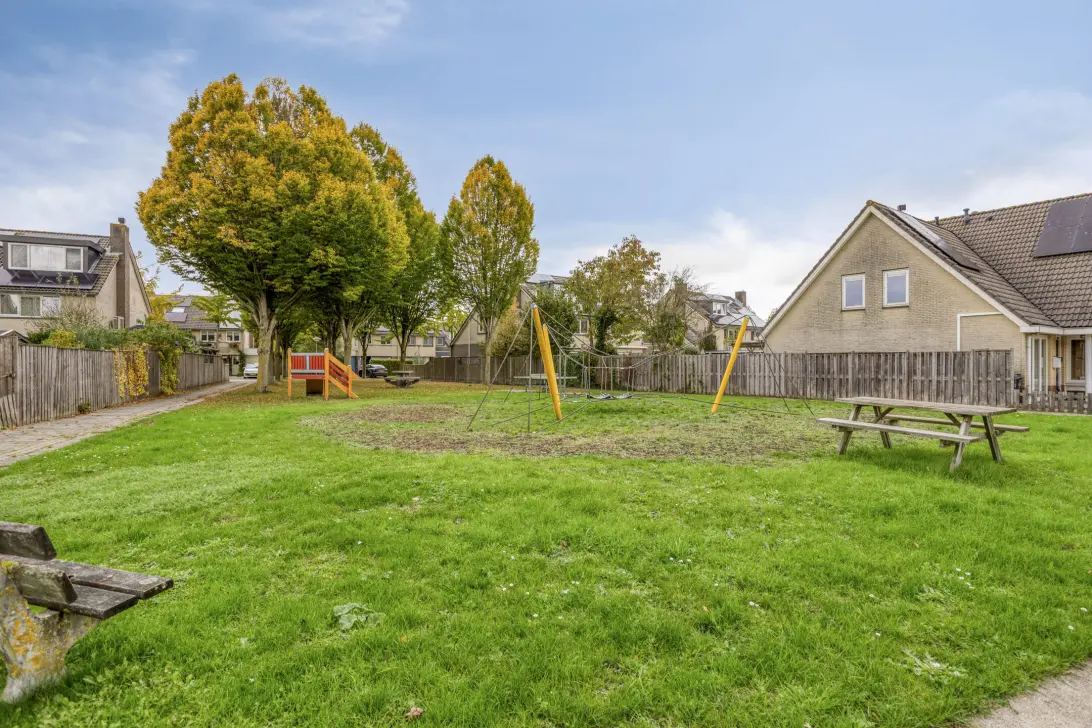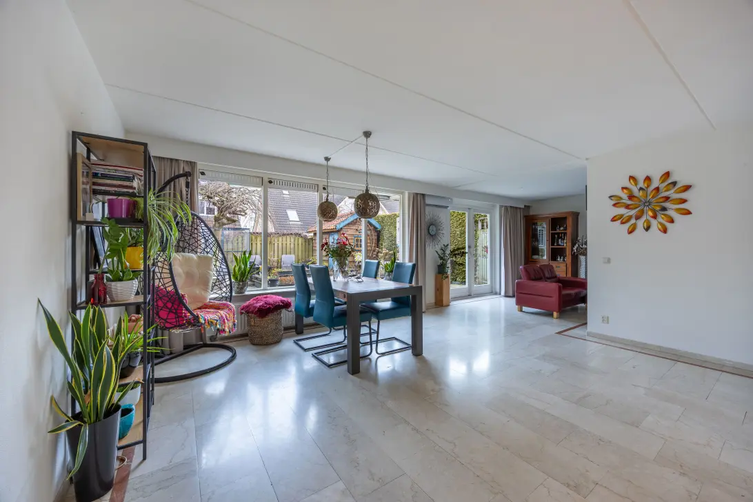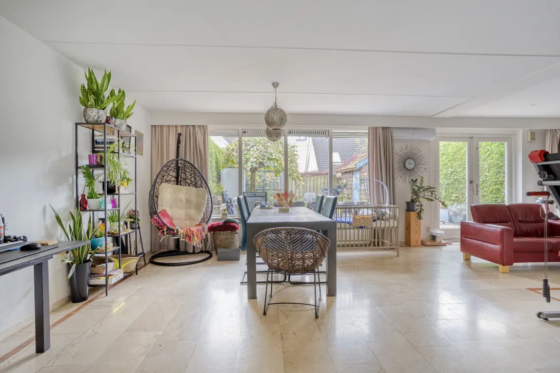Aan de achterzijde bevindt zich de ruime woonkamer met grote raampartijen en een airco voor een comfortabel binnenklimaat. Er is voldoende ruimte voor zowel een gezellige eethoek als een royale zithoek. Via de tuindeur bereikt u de achtertuin.