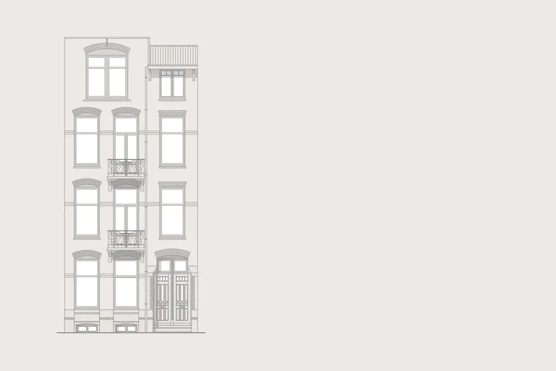 Through the central entrance and staircase, the residence is reached on the second floor. Here, the living spaces are arranged in a classic en suite layout: a front-facing living room overlooking the square, an adjoining study, and a dining room at the rear—connected by sliding doors and fitted cabinets. Wooden floors and original fireplaces lend both rooms a distinctive character. The enclosed kitchen at the rear is practical in design. An internal staircase leads to the third floor, where three bedrooms are situated. The primary bedroom at the rear features double doors opening onto a private terrace. At the front are two additional rooms, one generous in size and one compact. The landing includes a separate toilet and several storage cabinets. The bathroom is light and spacious, equipped with a bathtub, washbasin, and laundry connections. A French balcony at the front and a rear terrace overlooking the inner gardens enhance the living experience. The option to create a rooftop terrace offers potential for further outdoor expansion. Classic Verhulst is a residence with character and promise—functionally arranged, quietly located, and defined by the architectural features typical of early twentieth-century townhouses.