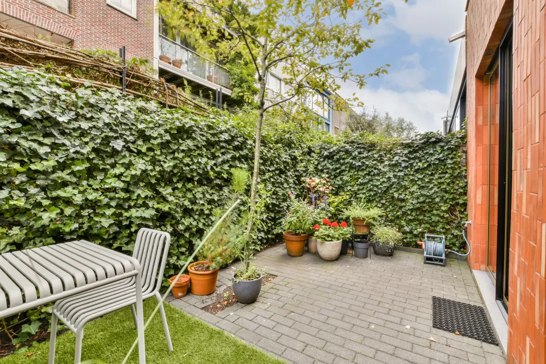 De knusse achtertuin van 6 m. breed en 3 m. diep heeft een groene erfscheiding met Hedera, wintergroen en andere klimop met geurende bloemen (o.a. Jasmijn). Centraal in de tuin staat een Krentenboom (Amelanchier lamarckii) die vroeg in het voorjaar witte bloesem heeft en later bessen waar de vogels dol op zijn. Geïsoleerde buitenkraan om beplanting bij te wateren als het droog is.