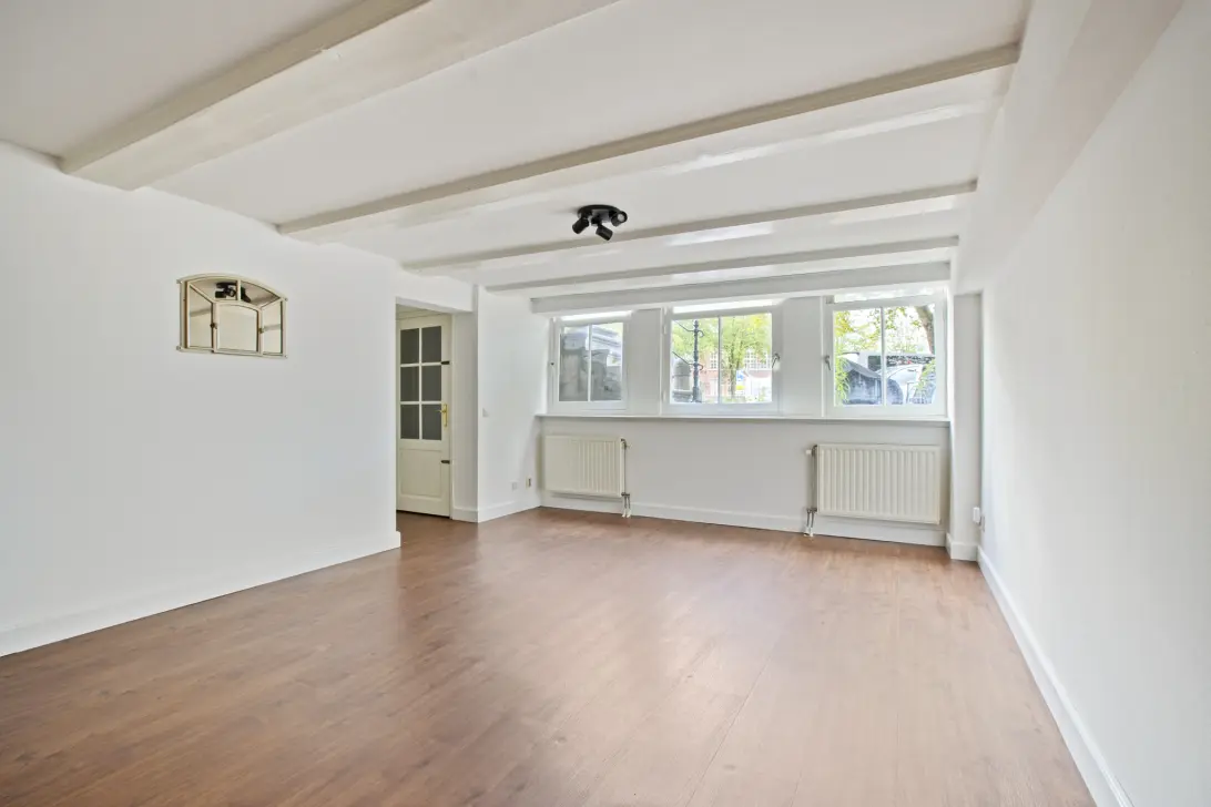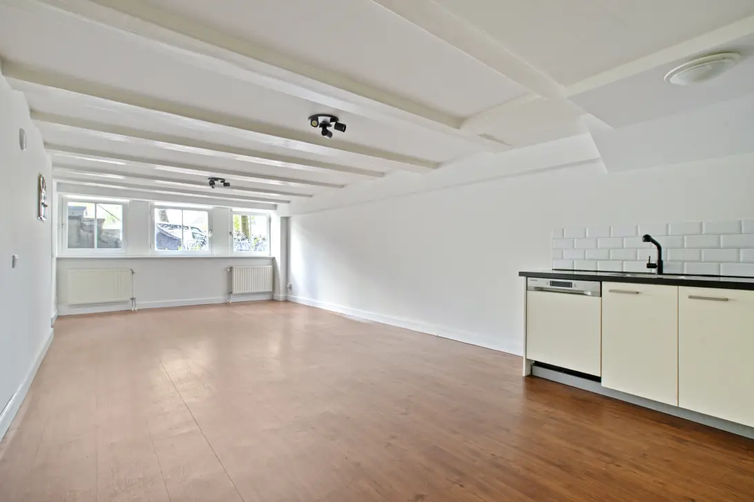 Vanuit de hal bereik je de lichte woonkamer aan de voorzijde, met een mooie plafondhoogte. Deze royale ruimte biedt voldoende plek voor een comfortabele zithoek en een eettafel. Aansluitend vind je de open keuken, die praktisch is ingedeeld en beschikt over extra bergruimte.