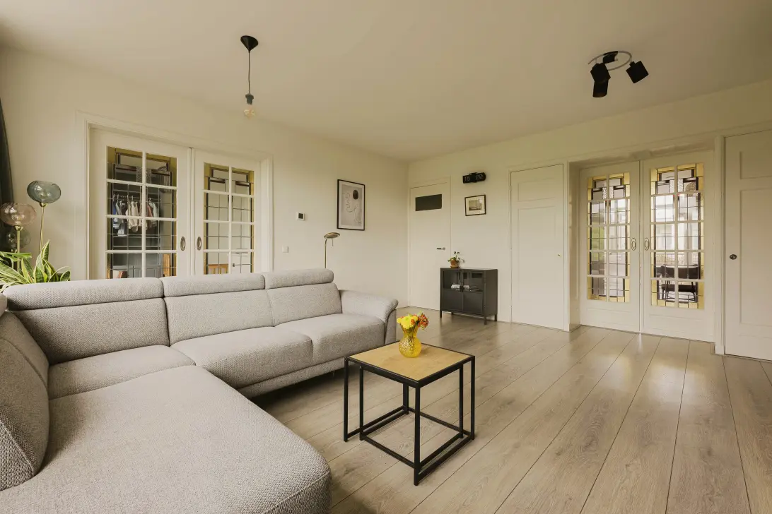 Via het verzorgde gemeenschappelijke trappenhuis bereik je de woning op de derde verdieping. In de hal vind je een garderoberuimte en een separaat toilet. De royale woonkamer is opvallend licht en biedt een vrij uitzicht op het groen en tennisbanen aan de voorzijde. De zijkamer is via fraaie glas-in-lood schuifdeuren verbonden met de woonkamer en is nu in gebruik als babykamer, maar is ook perfect als werk- of logeerkamer.