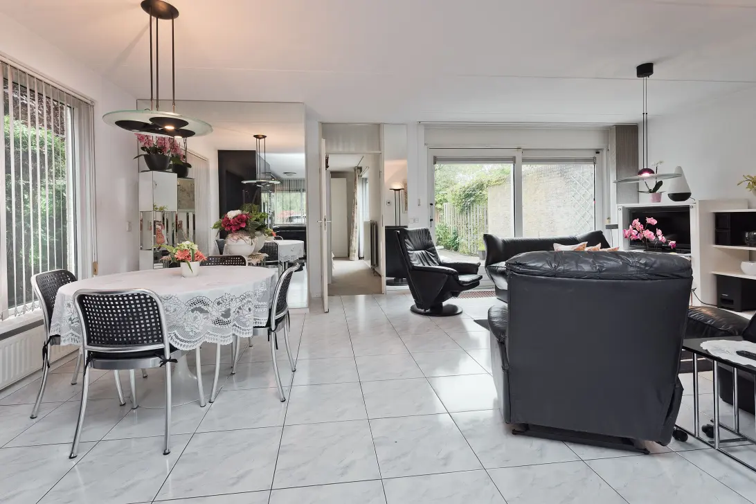 • Ruime, lichte woonkamer met schuifpui naar de tuin en een zonnescherm