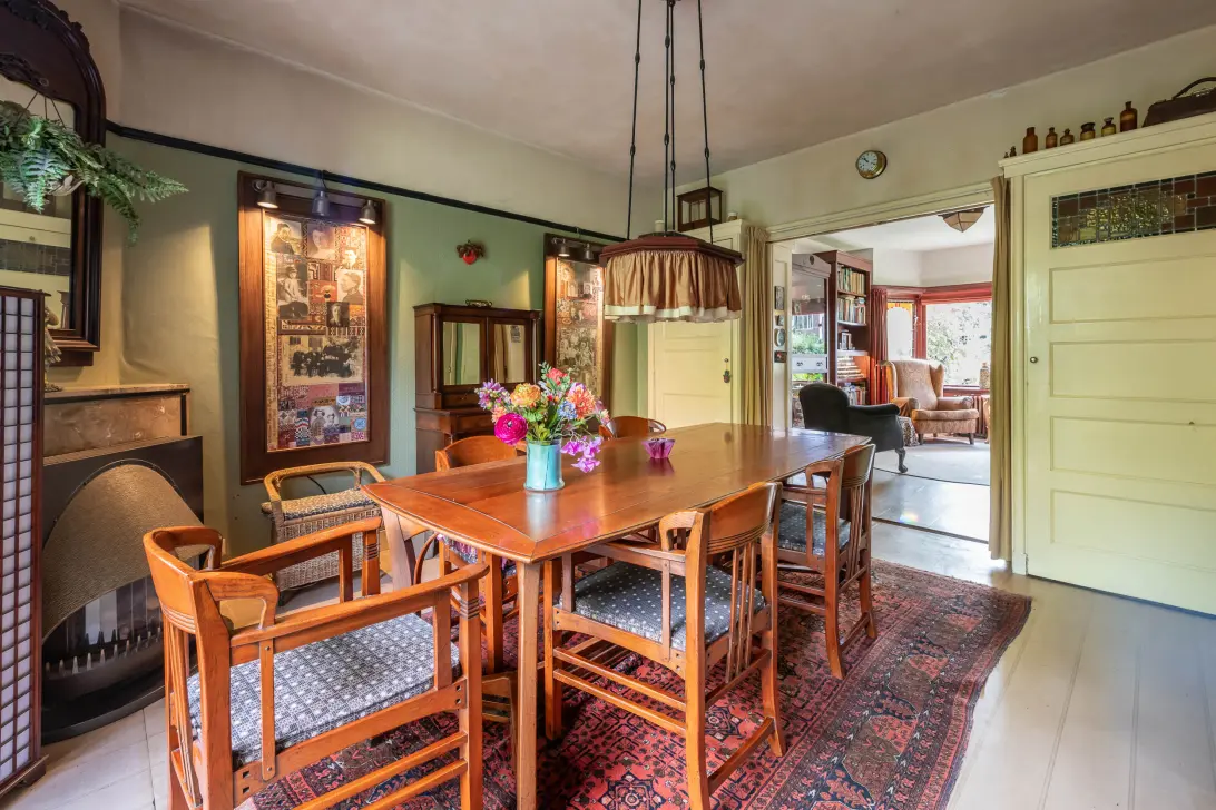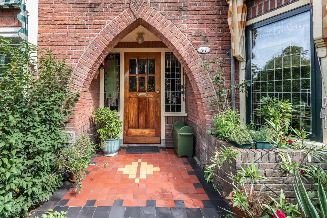 Stijlvolle entree, vestibule met tegelvloer, voorzien van originele tegelwand, glas-in-loodraampartij en glas-in-looddeur naar de hal, voorzien van originele tegelwand, parketvloer, kelderkast en toilet met fontein. Ruime sfeervolle kamers en suite, elk voorzien van twee vaste suitekasten. De zitkamer met brede erker aan de voorzijde (op het zuiden), de eetkamer met openslaande deuren naar terras en achtertuin. Keuken met granito aanrecht en ingebouwd gasfornuis en elektrische oven en deur naar bijkeuken met cv-ketel (2023) en deur naar de achtertuin.