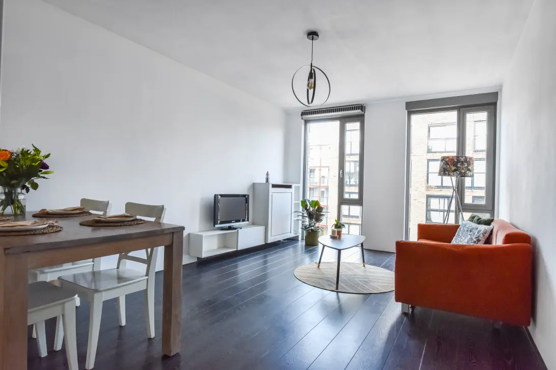 From the hallway, you walk into the bright living room, which immediately stands out due to the large rear-facing windows that let in plenty of natural light. The living space feels open and airy, with ample room for both a comfortable lounge area and a dining table. It’s the perfect space to unwind after a long day or to enjoy meals with family and friends. The dining area flows seamlessly into the modern kitchen, creating an inviting and functional living space.