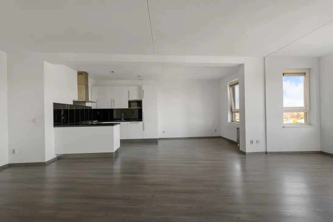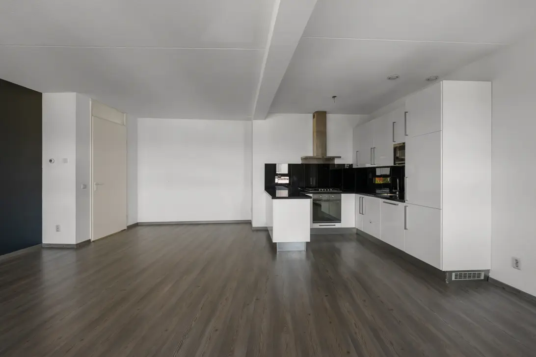 Via de brede hal openen we de deur naar de verrassend royale woonkamer. Deze leefruimte is echt een eyecatcher: zeer ruim van formaat en perfect in te richten met een grote hoekbank én een grote eettafel. De aangrenzende open keuken met gezellig baretje maakt het geheel compleet. Hier kook je met plezier terwijl familie of vrienden aanschuiven. Direct aan de woonkamer ligt het overdekte balkon, gelegen op het westen, een fijne plek om na een drukke dag te ontspannen in de middag- en avondzon.
