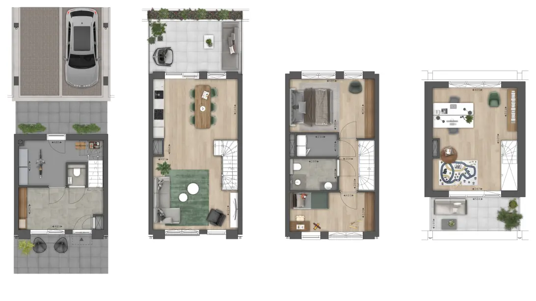 Zowel voor type A als voor type B is er keuze tussen een hoekwoning, een tussenwoning en/of een verbijzonderde tussenwoning.