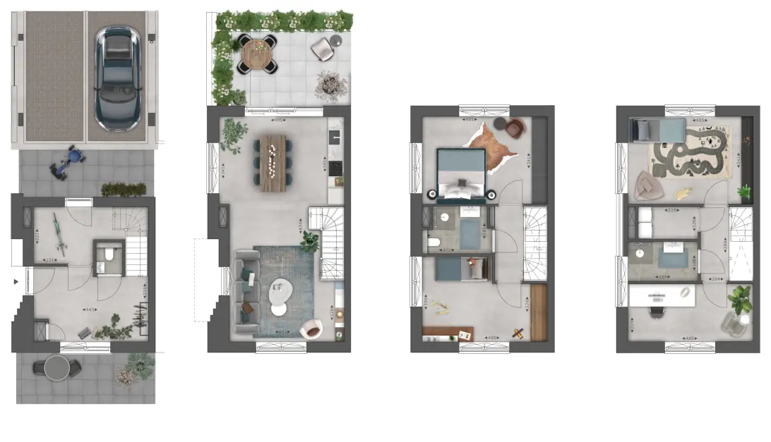 Zowel voor type A als voor type B is er keuze tussen een hoekwoning, een tussenwoning en/of een verbijzonderde tussenwoning.