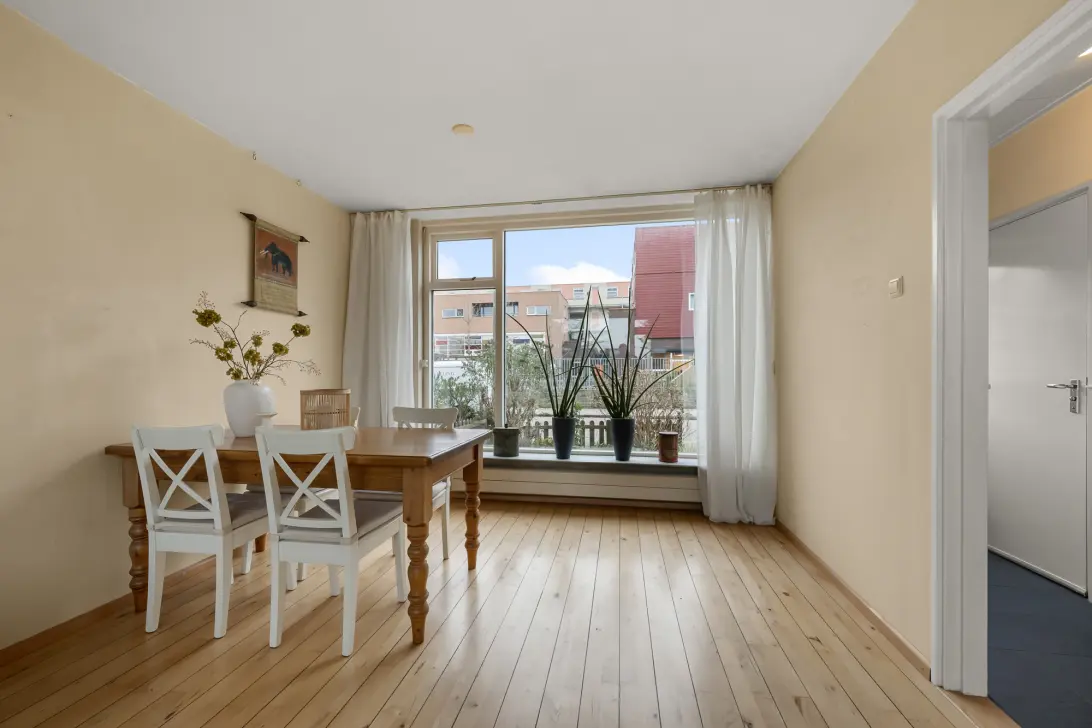 Via de voortuin bereik je de entree van de woning. De hal biedt toegang tot de woonkamer, keuken en het separate toilet. De doorzonwoonkamer is licht en prettig ingedeeld: aan de voorzijde richt je eenvoudig een gezellige zithoek in en richting de tuin is volop ruimte voor een eettafel. De grote ramen zorgen de hele dag voor een mooie lichtinval.