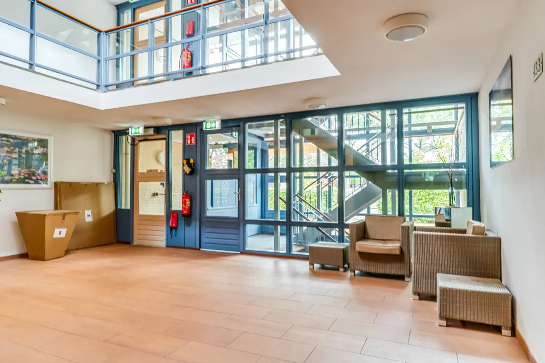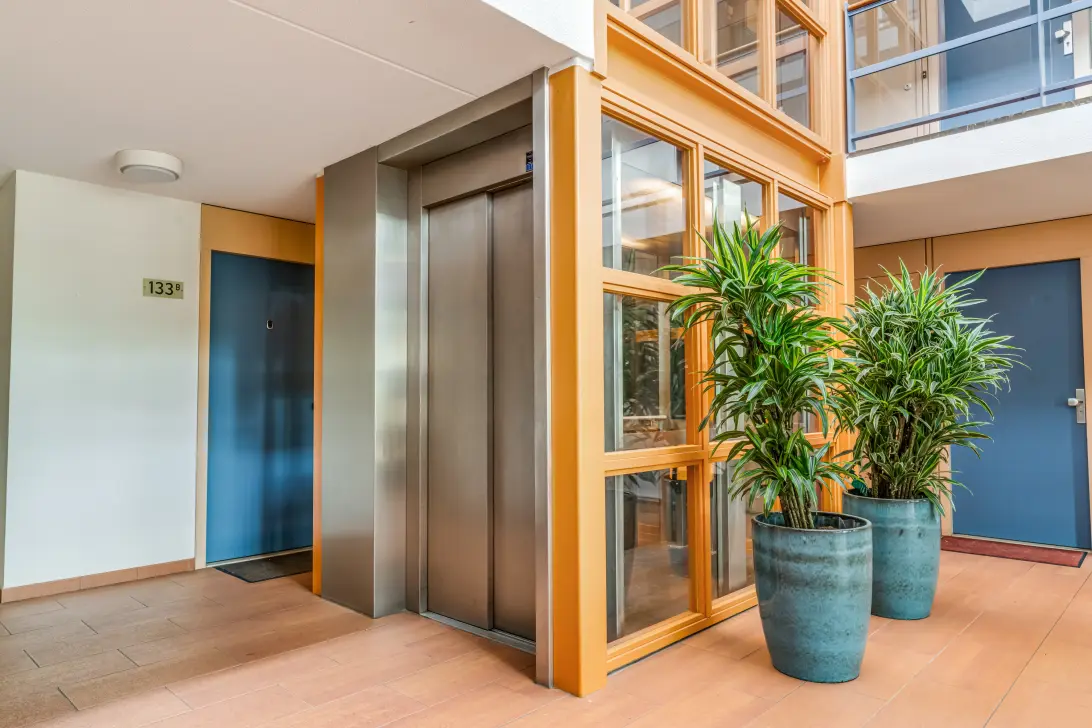 Afgesloten entree met intercom, bellentableau, elektrische toegangsdeuren en lift.