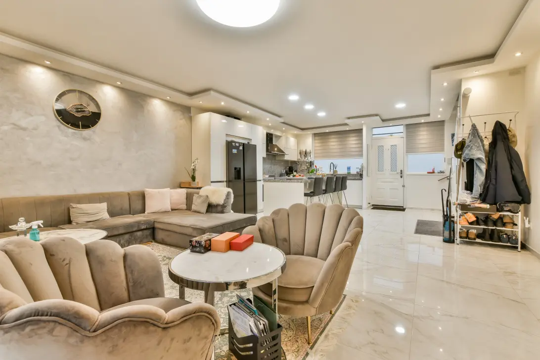 The living room, the heart of your new home, is filled with light from the large windows. Here, you’re greeted by the aroma of fresh coffee wafting from the modern kitchen with its central island. Whether you’re hosting a dinner party or enjoying an intimate family meal, this kitchen is equipped to fulfill all your culinary dreams.