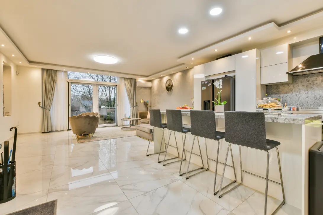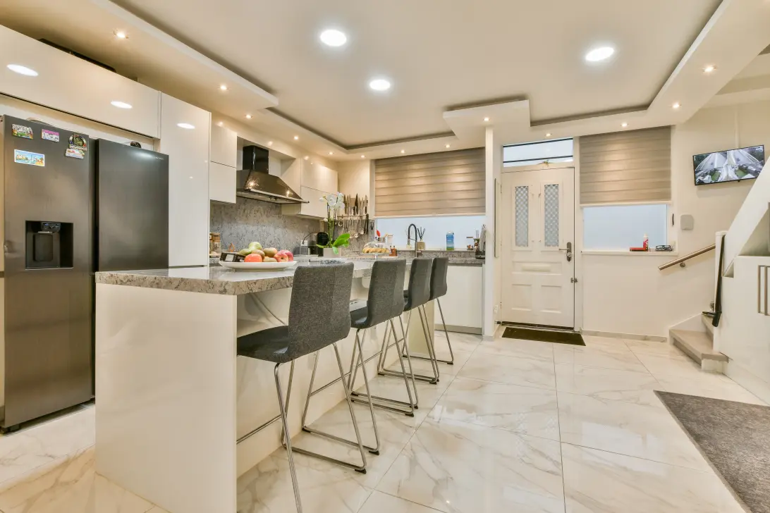 De woonkamer, het kloppend hart van je nieuwe thuis, baadt in het licht dankzij de grote ramen. Hier kun je je laten meeslepen door de geur van verse koffie die vanuit de moderne keuken met eiland je neus bereikt, terwijl je geniet van het gezelschap van je gezin in de stijlvolle eetruimte. Of je nu houdt van koken voor vrienden of een intiem diner met je gezin, deze keuken is uitgerust om aan al je culinaire wensen te voldoen.
