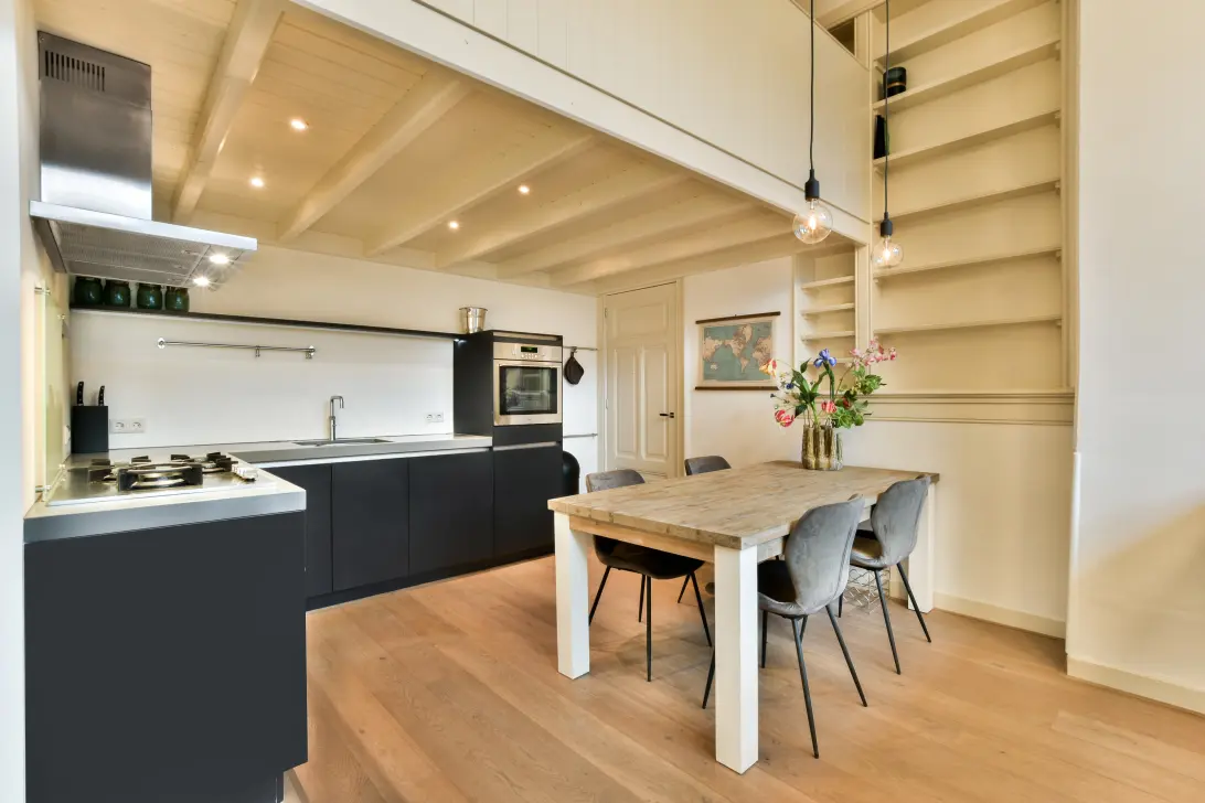 The open Kitchen is equipped with various built-in appliances such as a 5-burner gas stove, Quooker, refrigerator and a dishwasher.