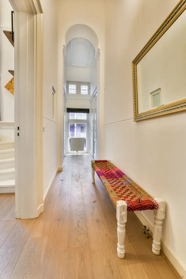 The entrance of the apartment is a long corridor with high windows through a beautiful en suite. In this corridor you will find the wardrobe and a guest toilet, the bathroom and a storage with room for a washing machine.