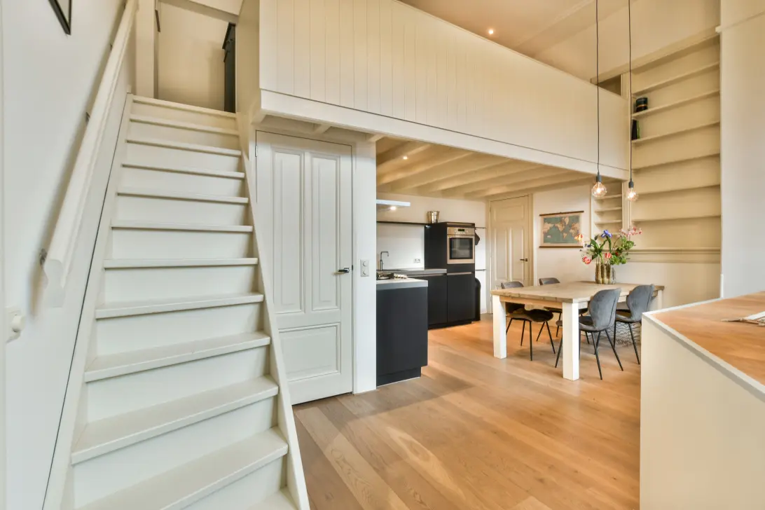 Trap naar entresol waar zich de ruime slaapkamer bevindt. onder het entresol is een grote inloopkast gerealiseerd, ook heel slim is de 'bonusberging' van meer dan 10 m² onder de verhoogde living.