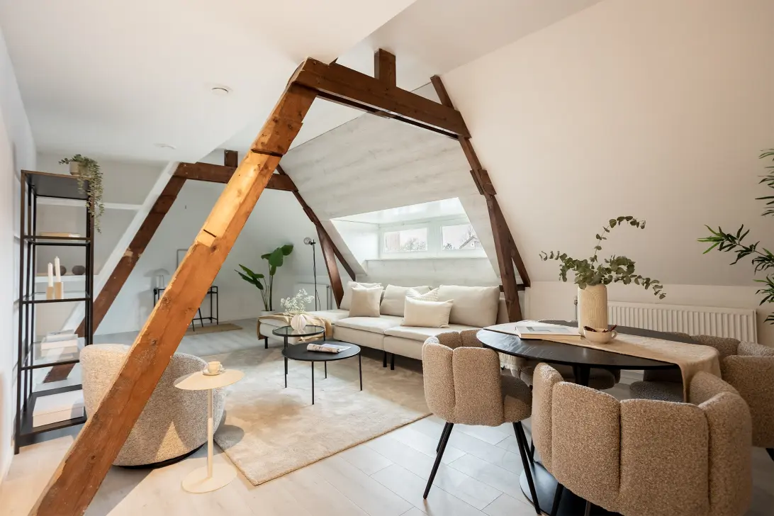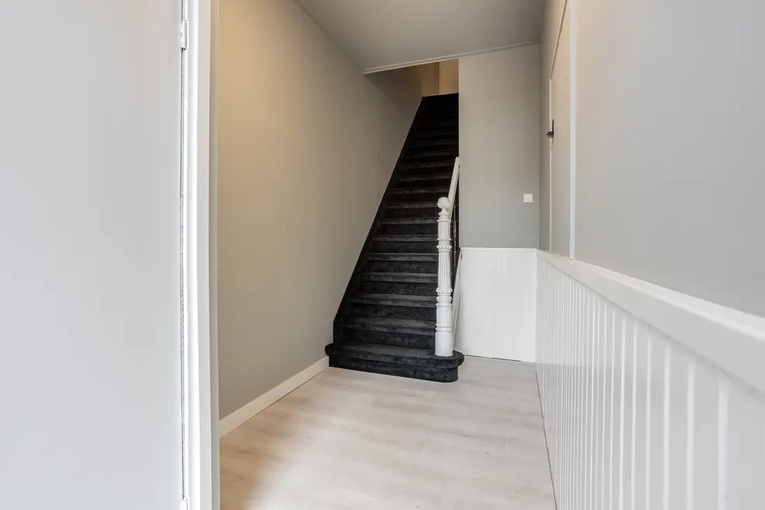 Via een vaste trap bereik je de entree van het appartement, waar zich de keuken bevindt. Deze is voorzien van diverse inbouwapparatuur, waaronder een inductiekookplaat, koel-/vriescombinatie, combi-oven en vaatwasser. De badkamer beschikt over een douchecabine en een wastafel met meubel. Apart toilet. Vanuit de hal heb je toegang tot de ruime woonkamer, waar de houten balken zorgen voor een karakteristieke en sfeervolle uitstraling. Het appartement telt twee ruime slaapkamers. Daarnaast is er een aparte ruimte aanwezig voor de cv-opstelling en de aansluitingen voor de wasmachine en droger.