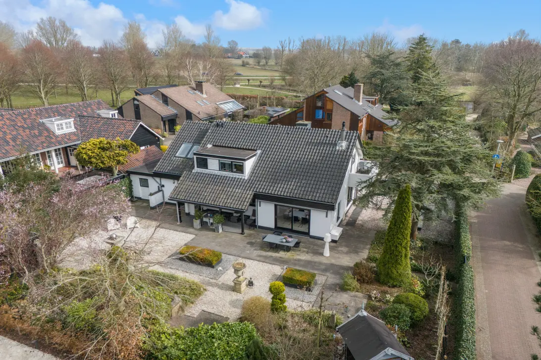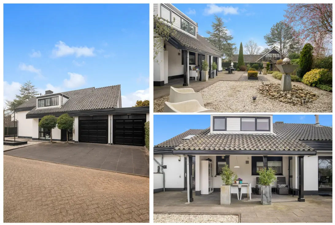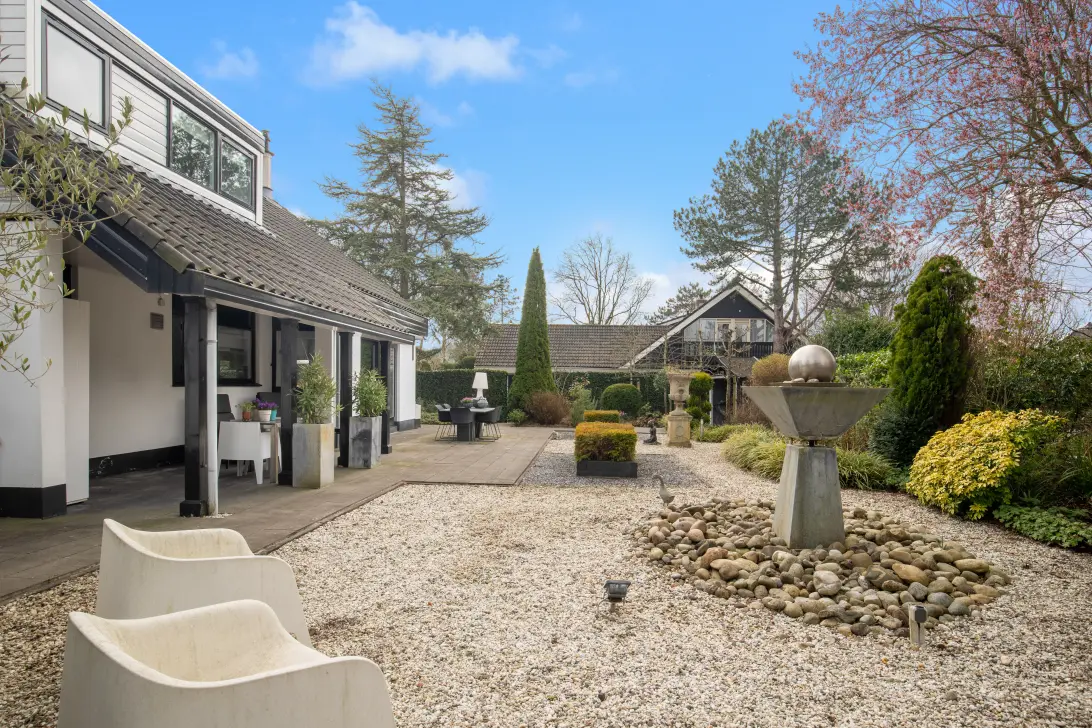 De woning heeft een luxe en moderne uitstraling en bij binnenkomst zie je dit ook direct terug. Je treedt binnen in de ruime hal en loopt vanaf hier de speels ingerichte woonkamer in. De woonkamer voelt ruim en sfeervol aan door de hoeveelheid natuurlijk licht dat binnenvalt door de vele raampartijen. De woonkamer beschikt over twee gezellige zithoeken en vanuit hier loop je door naar het eetgedeelte waar je heerlijk lang kunt tafelen. Vanuit het eetgedeelte kijk je de verzorgde open keuken in die van alle gemakken is voorzien.