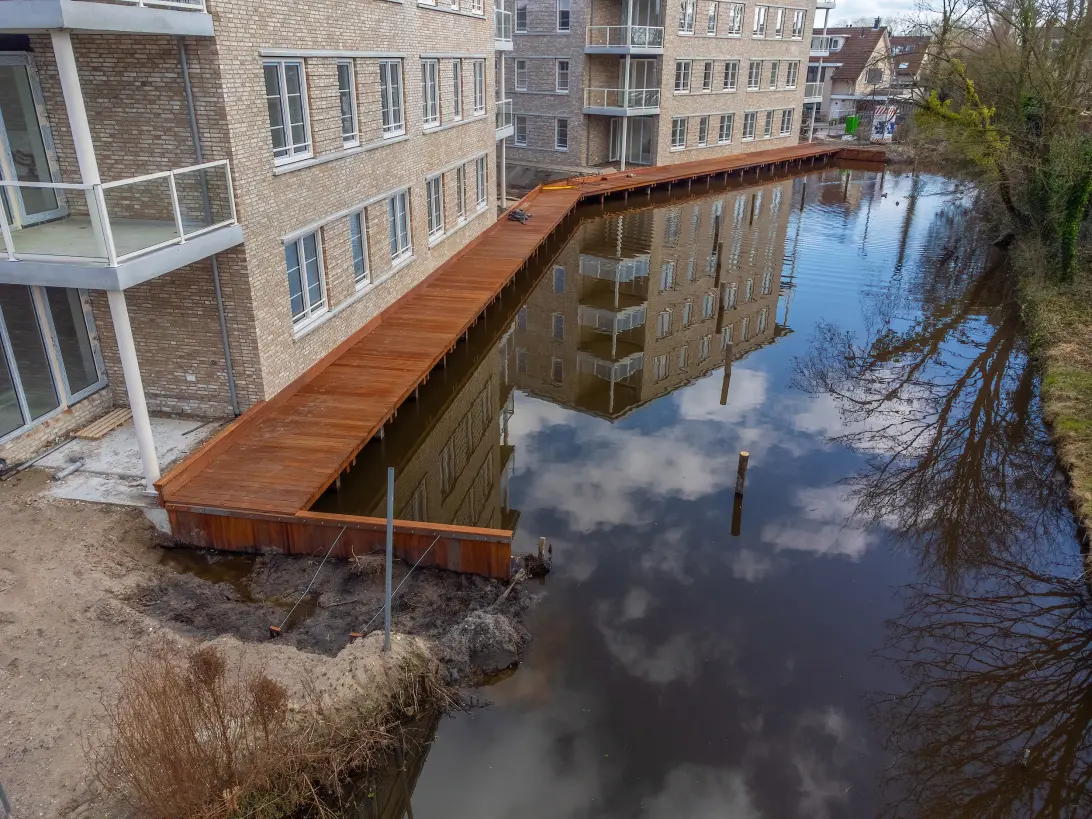 - Stevige houten steiger met aanlegring en meerpalen