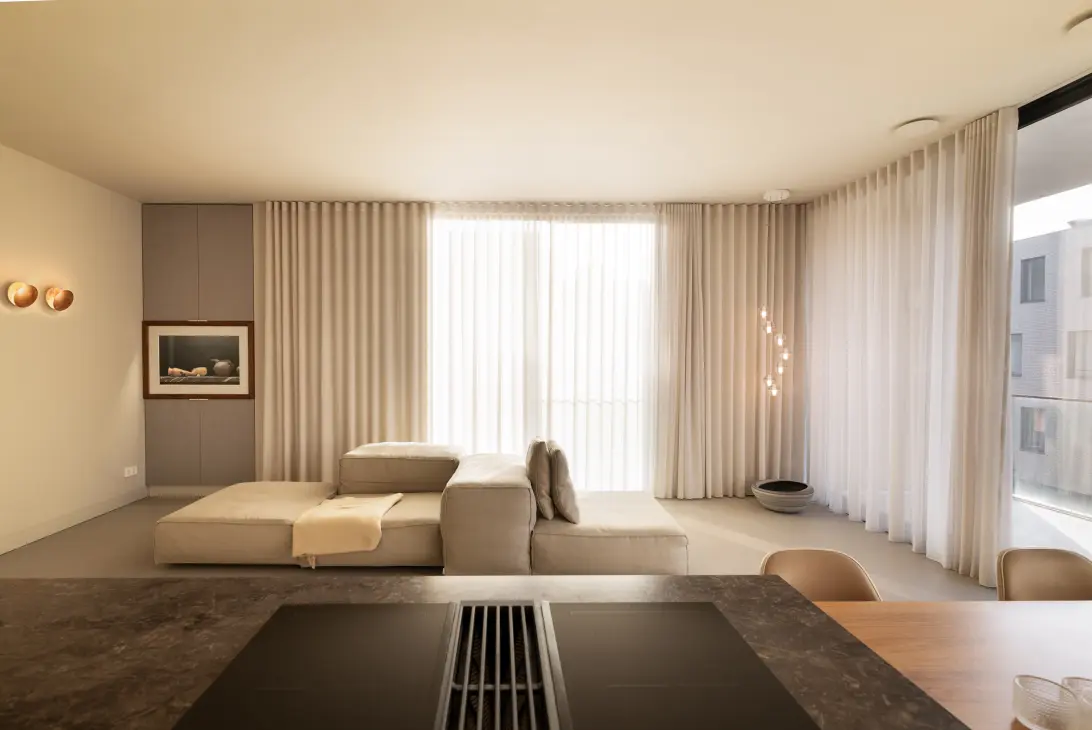 De lichte woonkamer is ingericht met oog voor eenvoud, balans en ruimtelijkheid. Grote ramen laten volop daglicht binnen. Een speciaal ontworpen vitrinekast, bedoeld als klein museum, combineert een glazen presentatiedeel met praktische bergruimte en sluit naadloos aan op het overige maatwerk. Slim ontworpen schuifdeuren verdwijnen optisch in de wand, waardoor de woonkamer sereen en georganiseerd blijft. Sculpturale verlichting van Bocci en Catellani & Smith, gecombineerd met een lichtplan van Kreon, accentueert de lijnen en hoogwaardige materialen in de ruimte.