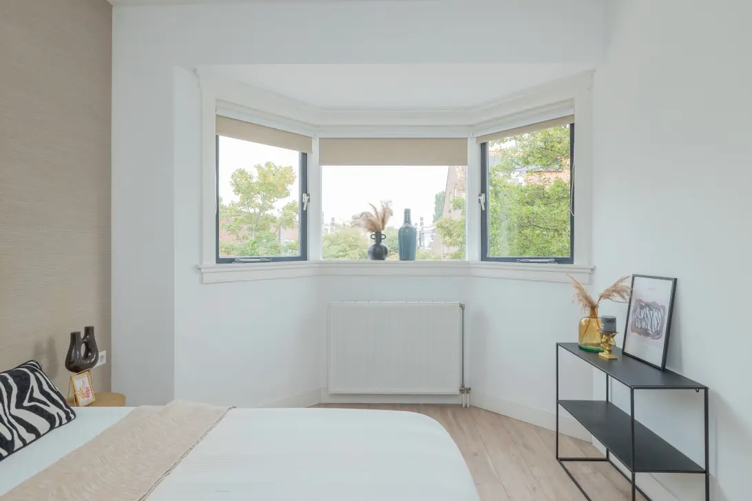 Overloop. 2 kamers aan de achterzijde, ruime kamer met erker aan de voorzijde, moderne badkamer met bad, inloopdouche, zwevend toilet en extra brede wastafelmeubel.