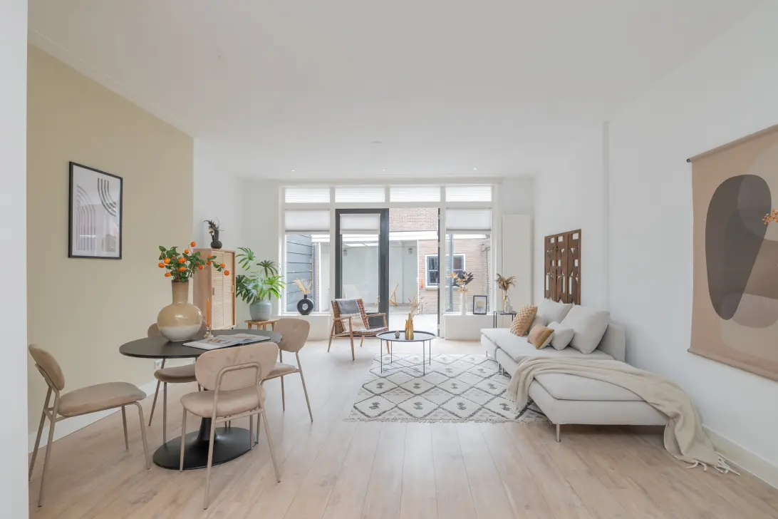 Bij binnenkomst in deze woning wordt u verwelkomd door een ruime, uitgebouwde woonkamer die veel lichtinval biedt. De grote raampartijen en openslaande deuren naar de achtertuin zorgen voor een prettige sfeer en een directe verbinding met de buitenruimte. De open woonkeuken is modern en uitgerust met hoogwaardige inbouwapparatuur, wat het een ideale plek maakt voor kookliefhebbers. Hier kunt u zowel gezellig koken als samen eten met familie en vrienden.