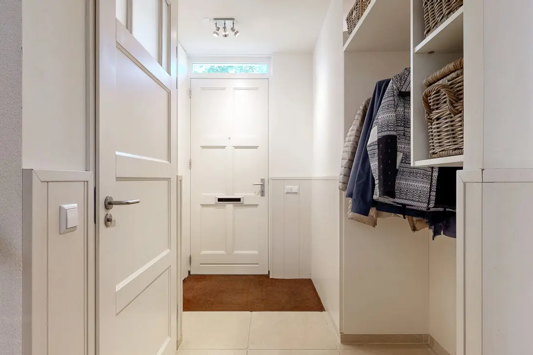 Via de verzorgde voortuin met eigen parkeerplaats bereikt u de ruime entree met garderobe, vaste kast, meterkast (glasvezelaansluiting, 9 groepen) en toiletruimte met wandcloset en fonteintje. Aan de voorzijde van het huis bevindt zich een praktische werkkamer, afsluitbaar met een stijlvolle schuifdeur met roedeverdeling en voorzien van een vaste kast met ingebouwde verlichting.