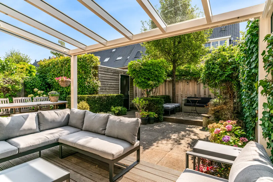 De zonnige woningbrede achtertuin, gelegen op het zuidoosten, is bereikbaar via een achterom en beschikt over een glazen overkapping met ingebouwd zonnescherm, vlonderterras, buitenkraan en een houten berging met elektra.