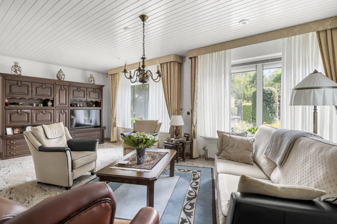 De woonkamer van de woning is een oase van licht en ruimte, dankzij de grote raampartijen die het daglicht rijkelijk binnenlaten. Dit zorgt voor een aangename en open sfeer, waarin u zich zeker thuis zult voelen. Centraal in de woonkamer bevindt zich een charmante haard, die uitnodigt tot het creëren van een gezellige zithoek. In de doorloop naar de keuken is er voldoende ruimte voor het plaatsen van een eettafel.