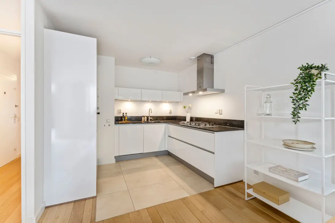 And then at the rear… that’s where the magic happens. Here you’ll find a living area of approximately 45 m², wonderfully wide with an open kitchen featuring high-end built-in appliances, including a Siemens combi-oven. Large sliding doors connect the living room to the fantastic south-facing terrace. This generous outdoor space feels like an extension of the living room and is a rare luxury in the Vondelpark area: quiet, private, and entirely yours.