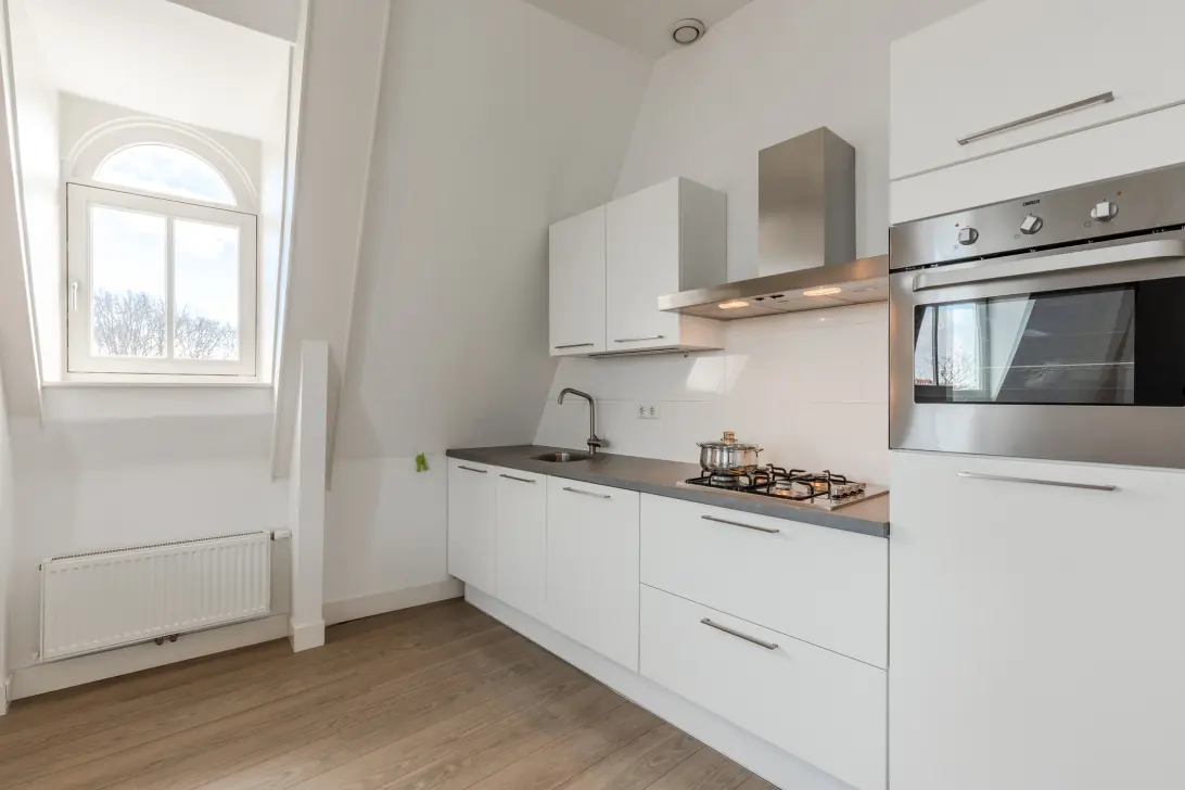 De open keuken is strak wit afgewerkt en voorzien van diverse inbouwapparatuur, waaronder een 4-pits gasfornuis met afzuigkap, vaatwasser, oven, koelkast en vriezer. In het midden van het appartement bevindt zich een separate wc.