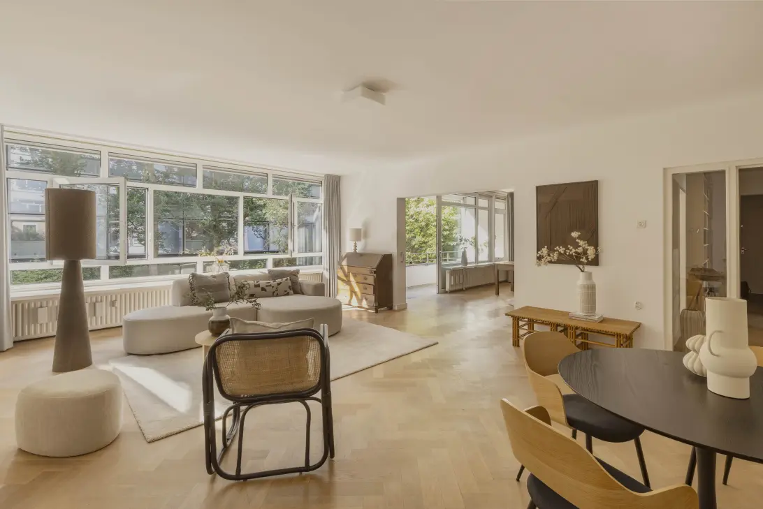 Aan de tuinzijde ligt de sfeervolle en lichte woonkamer met over de gehele breedte grote raampartijen, met uitzicht op veel groen. Via de woonkamer is er toegang tot het ruime balkon.