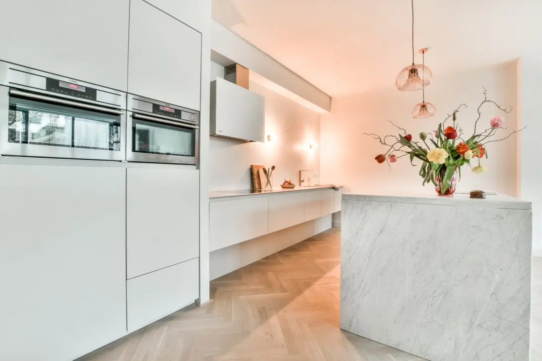 De moderne, open keuken met kookeiland beschikt over diverse moderne inbouwapparatuur waaronder: een klimaatkast, inductiekookplaat, oven en vaatwasser