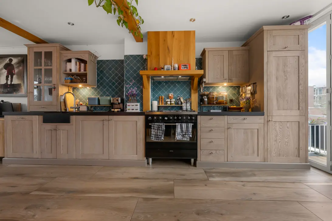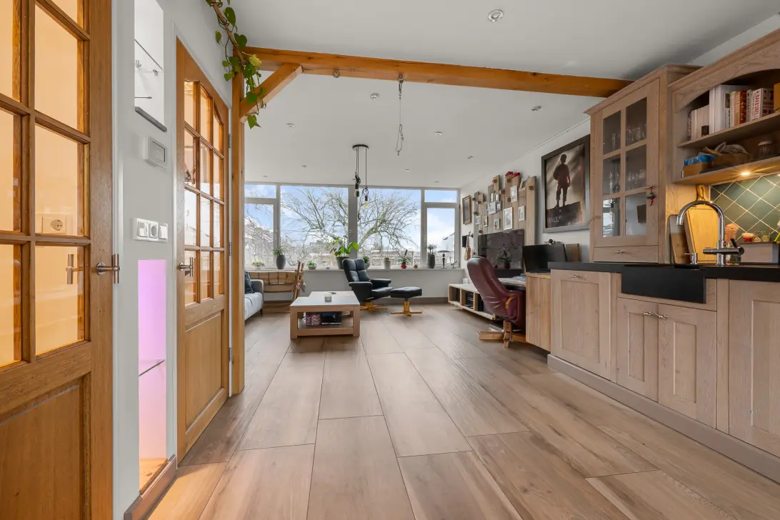 6-pitsgasfornuis met oven en afzuigkap, koel-/vriescombinatie en een separate magnetron. Het geheel is afgewerkt met een werkblad van hardsteen. De woonkamer is gesitueerd aan de achterzijde van de woning en kijkt fraai uit over het water en de omgeving. De grote raampartijen zorgen voor een mooi uitzicht over de omgeving en verrassend veel lichtinval. Deze verdieping is volledige voorzien van vloerverwarming en en balkon aan de keukenzijde, tevens westzijde van de woning.