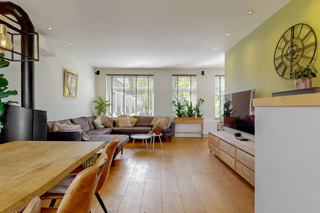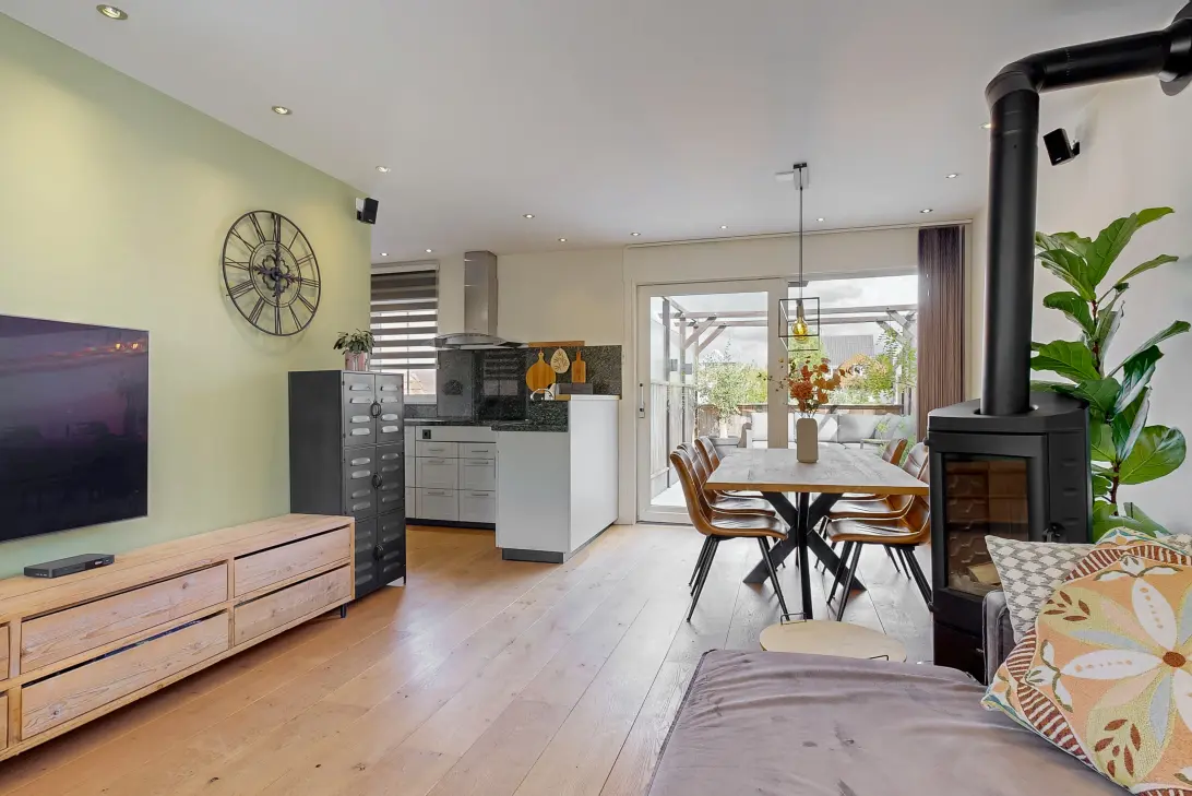 Eerste verdieping: hal met tweede toilet (2022), via de keuken toegang tot de woonkamer over de gehele lengte van de woning. De keuken is voorzien van een vaatwasser op hoogte, 5 zones inductiekookplaat, verhoogd granieten werkblad, koelkast en vriezer. De woonkamer is voorzien van lamelparket, een sfeervolle houtkachel, elektrische zonnewering, gestuukte wanden en airco (2025). Middels de schuifpui toegang tot het sfeervolle dakterras.