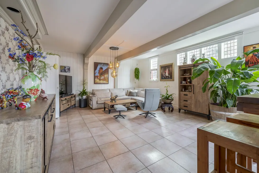 Aan de voorzijde is de ruime woon-/eetkamer, met een breedte van meer dan 8 meter. De glas-in-loodramen, de balken met korbelen en het tegeltableau bij de schouw bepalen de sfeer. Lichtinval is er vanaf de zuid- en westkant, wat de woonkamer heel ruimtelijk maakt.