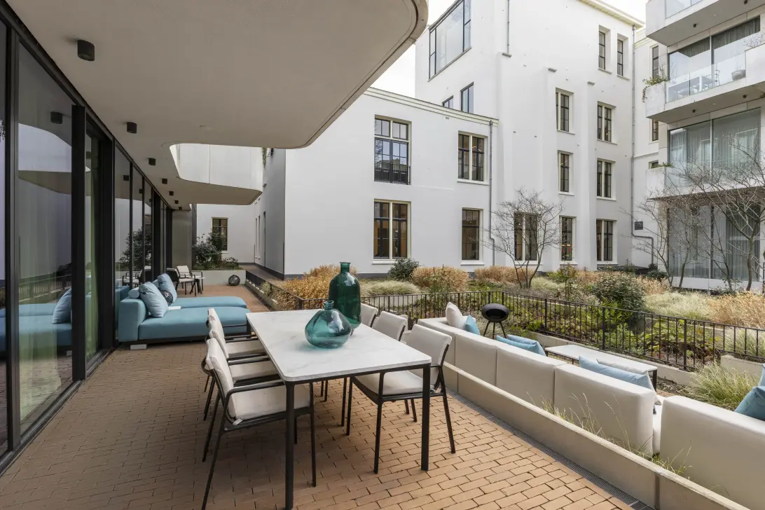 Grote glazen deuren creëren een sterke binnen-buitenbeleving en openen naar het brede terras op het zuidwesten. Het terras voelt als een verlengstuk van het interieur en biedt uitzicht op de prachtig aangelegde binnentuin van Piet Oudolf, een groene, rustige omgeving midden in de stad.