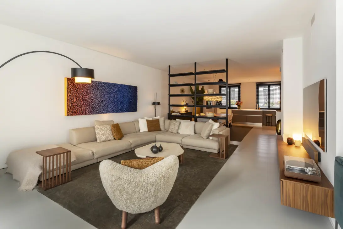 De royale leefruimte met een plafondhoogte van circa 3 meter strekt zich uit over de volledige diepte van het appartement. Aan de voorzijde bevindt zich de woonkeuken, uitgevoerd in een strak en tijdloos ontwerp van het Italiaanse Boffi, met een kookeiland en hoogwaardige inbouwapparatuur. De leefruimte vloeit naadloos over in de zitkamer en het aangrenzende terras.