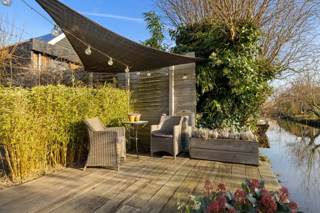 The property boasts a generous 122 m² garden, ideally located on the south-east and directly on navigable water. You can moor your own boat at the private jetty, step on board and sail away straight from your backyard — a rare and special feature. The garden is beautifully maintained, offering a nice balance between greenery and seating areas. From the garden, you have access to a detached shed and an internal storage space that houses, among other things, the central heating system.
