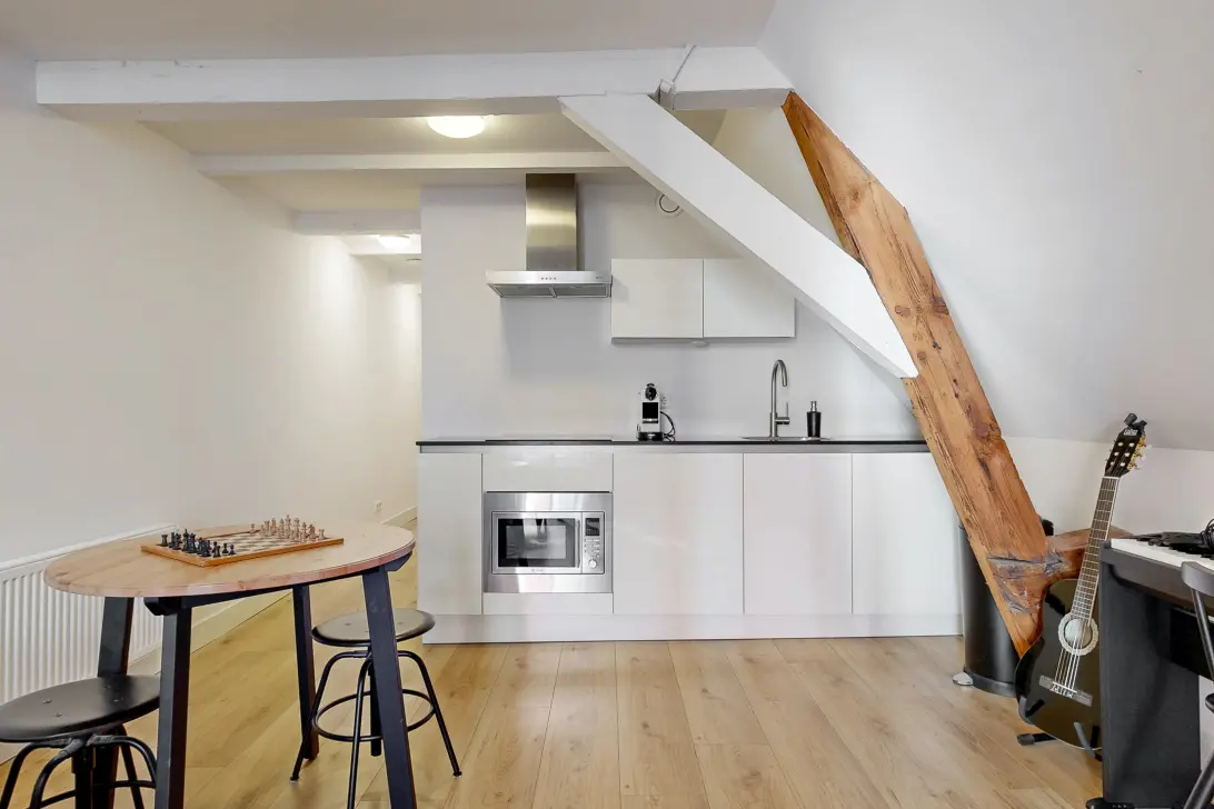 Het appartement beschikt over één slaapkamer, prachtig afgewerkt met strakke witte wanden en een fraaie laminaatvloer. Deze neutrale tinten in combinatie met het brede dakraam zorgen voor een rustgevende slaapkamer waarin je een heerlijke nachtrust tegemoet gaat.