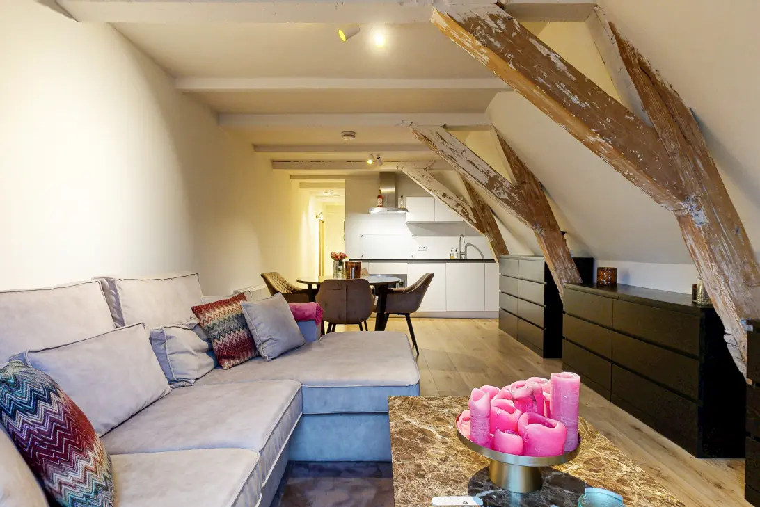 Het appartement beschikt over één slaapkamer, prachtig afgewerkt met strakke witte wanden en een fraaie laminaatvloer. Deze neutrale tinten in combinatie met het brede dakraam zorgen voor een rustgevende slaapkamer waarin je een heerlijke nachtrust tegemoet gaat.