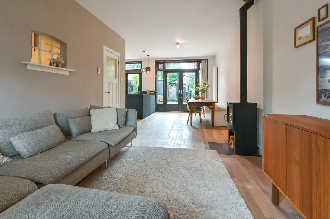 Parterre: entree; vestibule met glas-in-looddeur; hal met trapkast en toilet; woonkamer met erker aan de voorzijde, massief eikenhouten vloer, houtkachel en een hardhouten pui aan de achterzijde met openslaande tuindeuren; moderne open keuken met Bora inductie kookplaat voorzien van geïntegreerde afzuiging, vaatwasser, Quooker, koelkast en oven.
